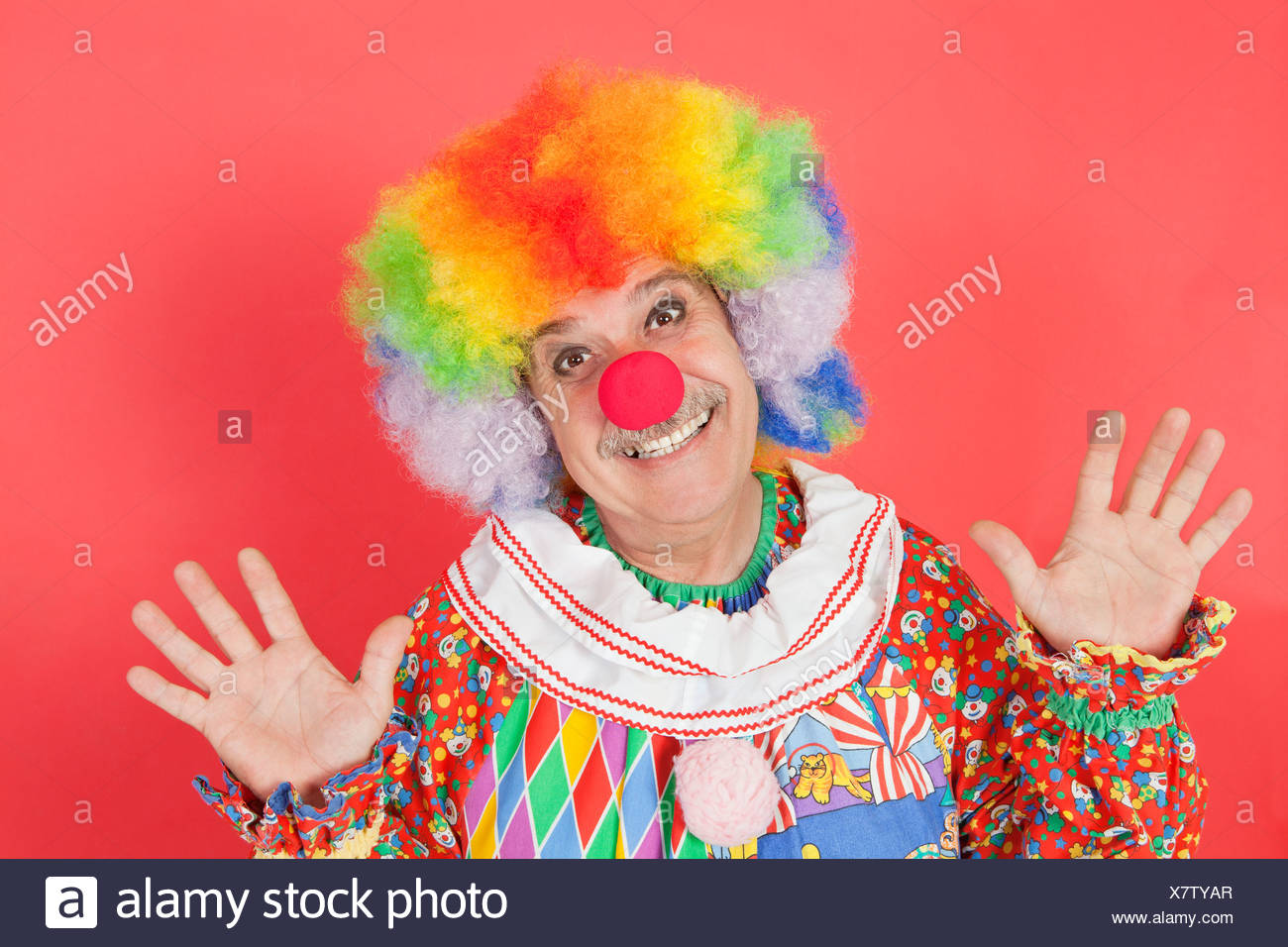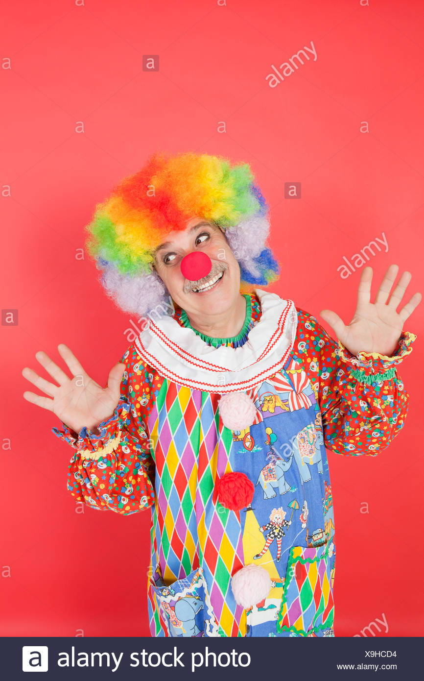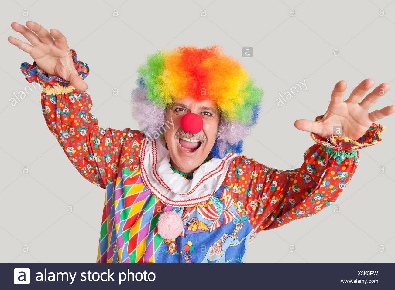 Ritratto Di Clown Divertenti Con Le Braccia Sollevate Contro Sfondo Colorato Foto Stock Alamy