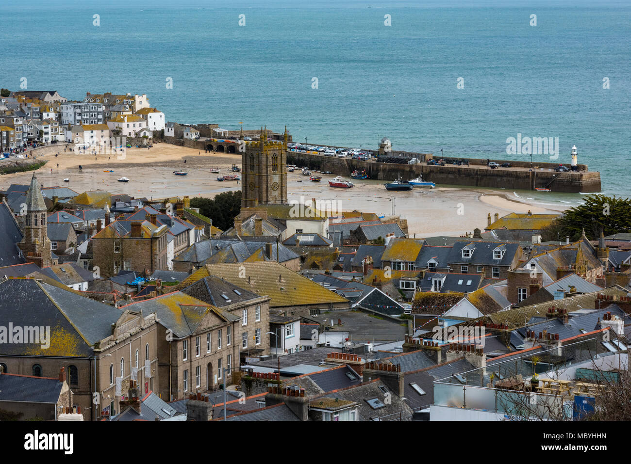 La Citta Di Saint Ives In Cornovaglia Occidentale Sul Cornish Coast Guardando In Giu Sul Porto E La Chiesa Con La Parete Del Mare E Del Faro Sul Lato Foto Stock