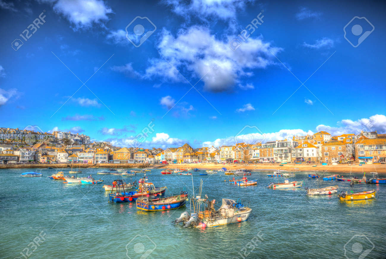 Immagini Stock St Ives Porto Cornwall England Con Le Barche Nel Porto E Il Blu Del Mare E Il Cielo In Questa Citta Tradizionale Di Pescatori Della Cornovaglia Nel Regno Unito