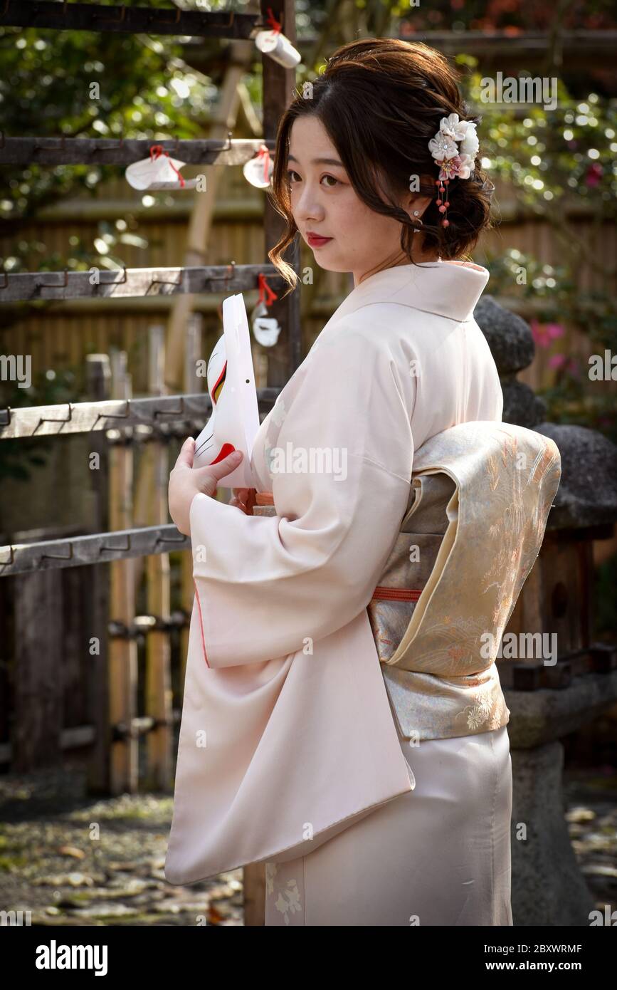 Teen Giapponese Che Indossa Kimono Tradizionale E In Posa Con Una Maschera Kitsune Maschera Di Volpe Giapponese Queste Maschere Sono Indossate Per Divertimento In Festival E Onorare Gli Dei Foto Stock