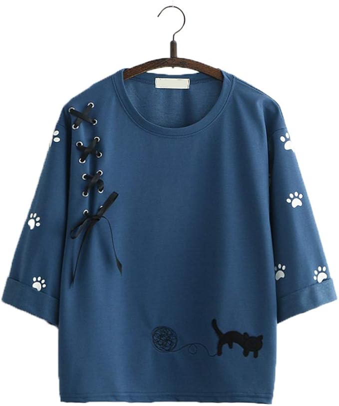 Packitcute Teen Girls Cat T Shirt Kawaii Ricamo Stile Giapponese Dolce Estate Divertente T Shirt Blu M Amazon It Abbigliamento