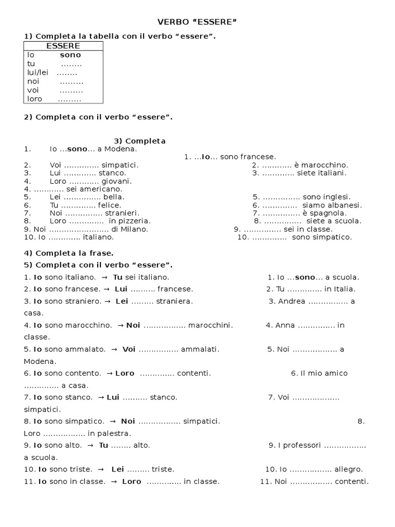 Essere e avere esercizi verbo essere e avere esercizi ID Language Italian School subject Italiano Grade/level 3 Age Main content Verbo essere e verbo avere Other contents Add to my workbooks (40) Embed in my website or blog Add to Google Classroom. I verbi spagnoli essere, avere, Nei verbi, il soggetto segue le stesse regole dell'italiano, e dunque può essere omesso( cioè non scritto es vado a scuola, ricorda che in inglese invece il soggetto va sempre indicato I go at school VERBO ESSERE Il verbo essere può essere reso, in spagnolo, sia con "ser", sia con "estar". 22nov18 Risultati immagini per verbi essere e avere ausiliari e propri.