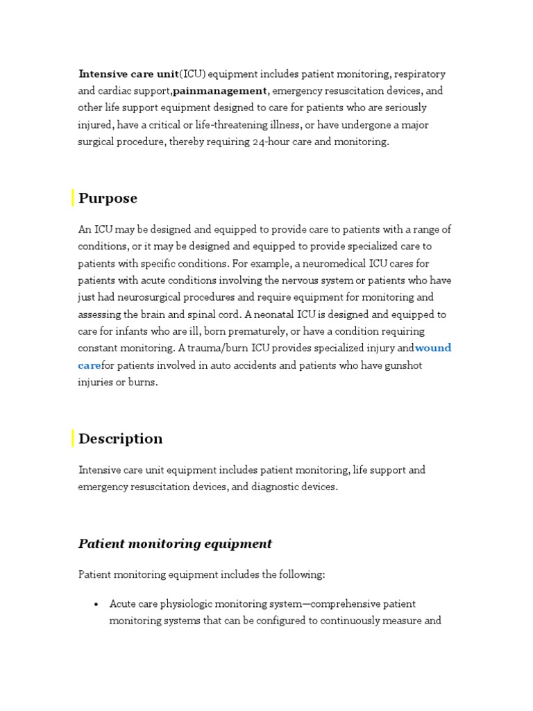 Number of intensive care beds in a facility, ICUs may include Surgical, Medical, Cardiac and Neurology, each addressing the specific needs of patients through specific clinical protocols, staff training, and equipment on the unit Throughout the healthcare industry, planning and design innovations are continuing to drive changes in the. Intensive care unit (ICU) equipment includes patient monitoring, respiratory and cardiac support, pain management , emergency resuscitation devices, and other life support equipment designed to care for patients who are seriously injured, have a critical or lifethreatening illness, or have undergone a major surgical procedure, thereby requiring 24hour care and monitoring. You are here Home » Documents » equipment devices and procedures in the intensive care unit.