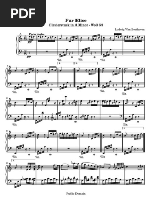 Per Elisa è un pezzo per pianoforte composto nel 1810 Il genere è quello della “Bagatella” che è un componimento molto semplice e leggero di musica da camera, sebbene in forma di Rondò, in La minore Si pensa che il brano sia stato dedicato da. Ludwig Van Beethoven Clavierstuck in A Minor WoO 59 Fur Elise 8 3 8 3 Poco moto pp pp 6 1 2 11 17 1 23 2 Public Domain. Per ELISA BEETHOVEN 3 8 Poco moto = 80.