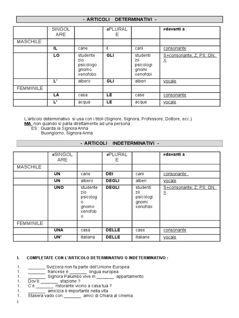 Io sono Giulia, la tua teacher di School2U, e oggi vedremo insieme gli articoli determinativi e quelli indeterminativi in Inglese, e come sempre. Un treno e una bicicletta un aeroplano e un’automobile uno stadio e una stazione How to Use Italian Indefinite Articles In Italian, an article is the variable part of discourse that appears before the noun to specify the gender and number of the noun. Metti gli articoli determinativi o indeterminativi 1 Ho amici simpatici Carlo e mio amico piu giovane, Enrica e piu anziana 2 Il signor Rossi e avvocato molto bravo, forse e piu bravo della citta 3 Vorrei panino con formaggio e verdura e lattina di aranciata 4 Noi abbiamo computer vecchio.