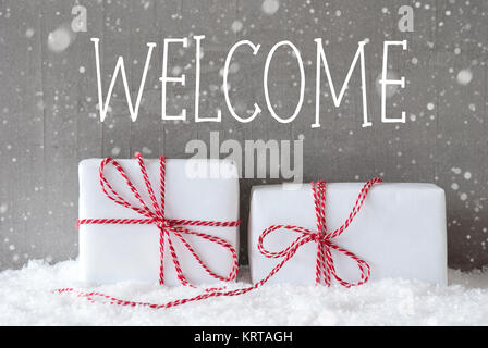 Testo Inglese Benvenuto Due Bianco Natale Regali O Presenta Sulla Neve Parete In Cemento Come Sfondo Moderno E Di Stile Urbano Scheda Per Il Compleanno O I Migliori Auguri Di Buon Natale