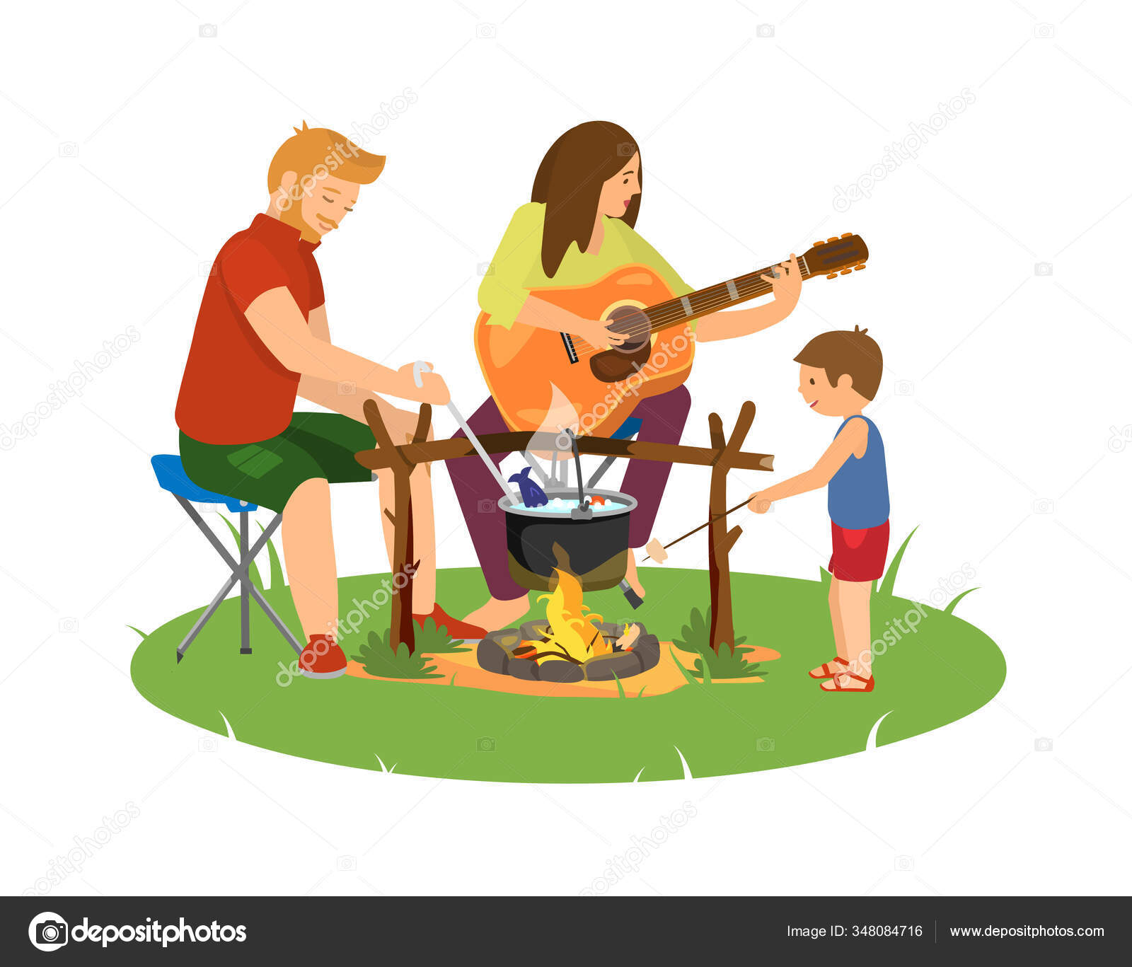 Famiglia Vicino Fuoco Campo Cucinare Zuppa Pesce Suonare Chitarra Sparare Vettoriali Stock C Gvardgraph