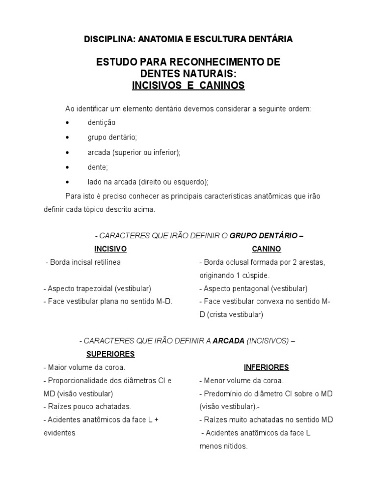 Texto Reconhecimento De Incisivos E Caninos Dente Anatomia Dentaria