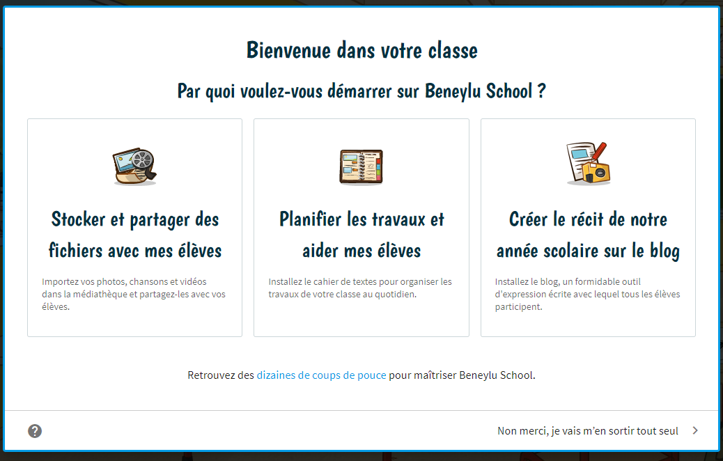 Beneylu School est intuitif pour les plus jeunes, très illustré et complètement sécurisé Vous pouvez y aller avec vos élèves !.