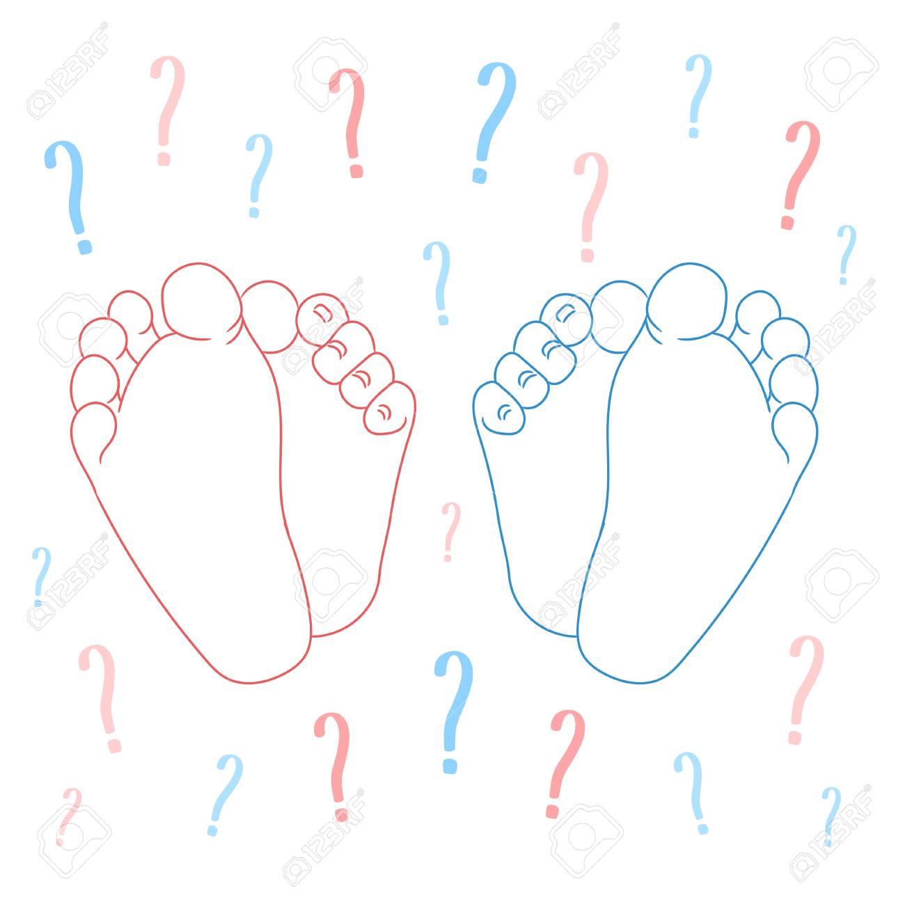 It S A Boy Or Girl Quiz Announcement Newborn Foot Soles Colored In Blue And Pink Question Marks On The Background Vector Illustration 免版税剪贴画 向量插图和股票 Image