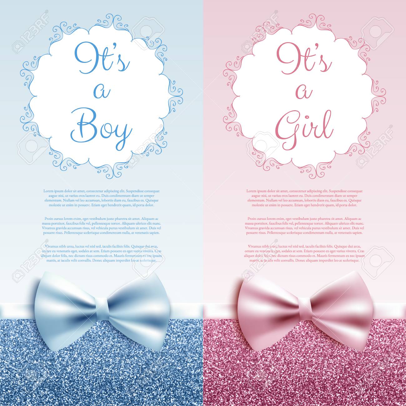It S A Boy Girl Baby Shower Cute Card Invitation With Blue And Pink Bow Vector Illustration Lizenzfrei Nutzbare Vektorgrafiken Clip Arts Illustrationen Image