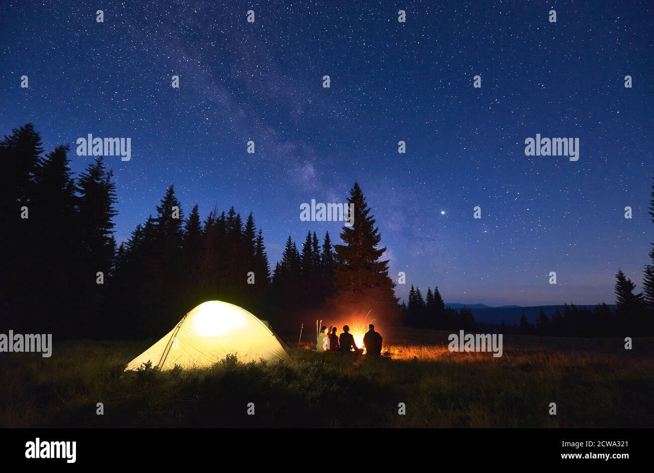 Night Camping Near Fire Forest And Mountains On Background Group Of Friends Warming Up Near Bright Bonfire People Sitting Near Tourist Illuminated Tent Under Night Sky Full Of Stars And Milky Way