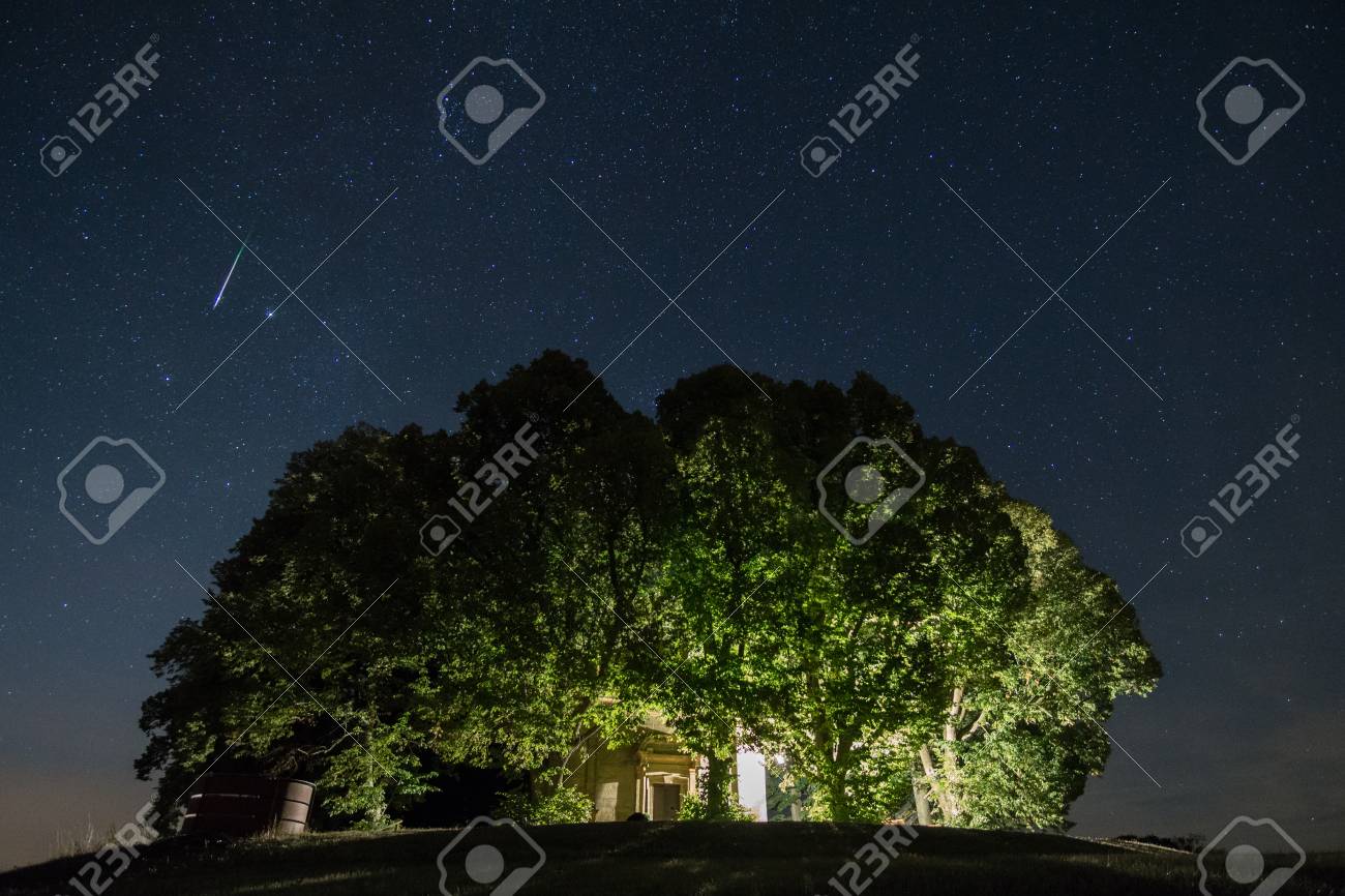 Illuminated Group Of Trees At Night With A Starry Sky And A Large Stock Photo Picture And Royalty Free Image Image