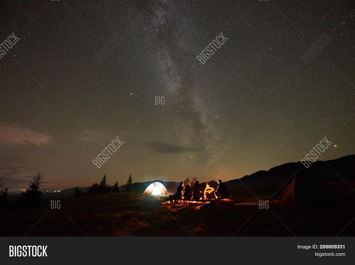 Night Camping Under Stars Group Of Five Tourists Men And Woman Stock Photo Picture And Royalty Free Image Image