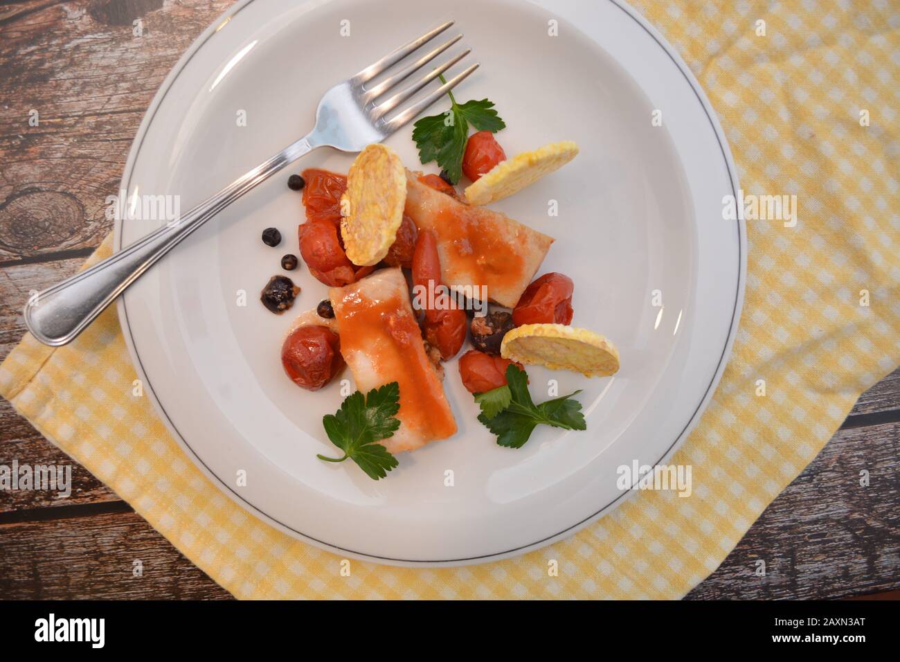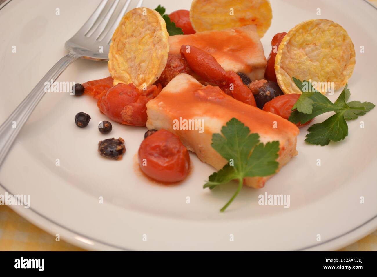 Piatto Di Pesce A Fette Di Merluzzo Con Pomodoro Gourmet Stock Photo Alamy