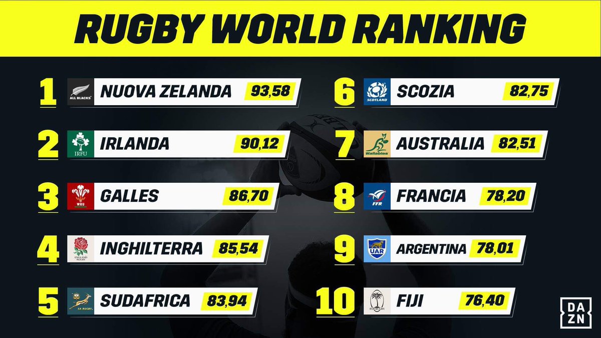 The All Blacks have slipped to third in the latest World Rugby rankings following their humiliating defeat to Argentina in the TriNations by Garrin Lambley 1511 0709. COVID19 may have severely restricted the number of test matches played in , but there was still significant movement in the World Rugby Men’s Rankings and World Rugby Women’s Rankings An impressive year for Rugby World Cup 23 hosts France was reflected in a rise of three places from seventh at the start of the year to fourth by its end. Dopo il primo inteso fine settimana di partite alla Rugby World Cup 19, il ranking mondiale si è già ridefinito Complice la vittoria contro il Sudafrica, gli All Blacks sono tornati in testa alla classifica scalzando dalla vetta l’Irlanda, mentre l’Inghilterra rimane stabile in terza posizione.