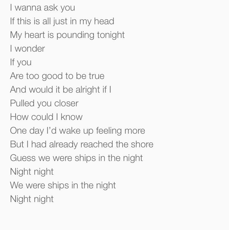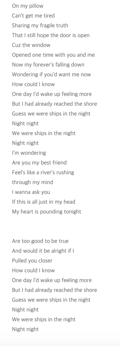 Sweet Night Compartir en Facebook Compartir en Twitter vistas Sweet Night V (BTS) On my pillow Can't get me tired Sharing my fragile truth That I still hope the door is open ’Cause the window Opened one time with you and me Now my forever's falling down Wondering if you'd want me now. Feels like a river's rushing through my mind I wanna ask you if this is all just in my head My heart is pounding tonight, I wonder If you are too good to be true. Guess we were ships in the night, night, night Ahahah, ahahah Ahahah, ahahah We were ships in the night, night, night Verse 2 I'm wondering, are you my best friend?.