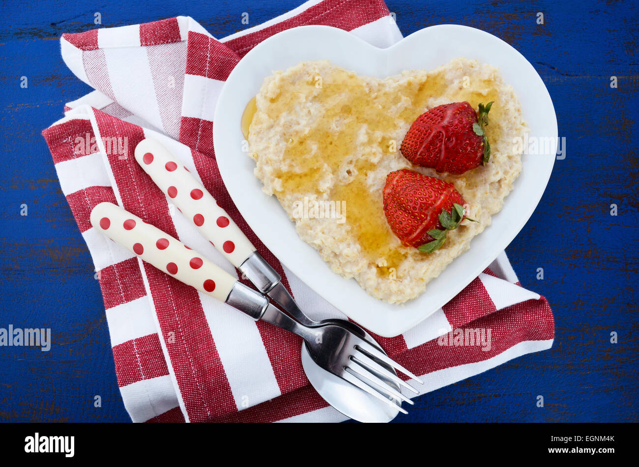 Piastra Del Nutriente E Sana Colazione Cotta Di Avena Con Fragole E Miele Nel Cuore Ciotola Sagomata Sul Blu Scuro Legno Rustico Foto Stock Alamy