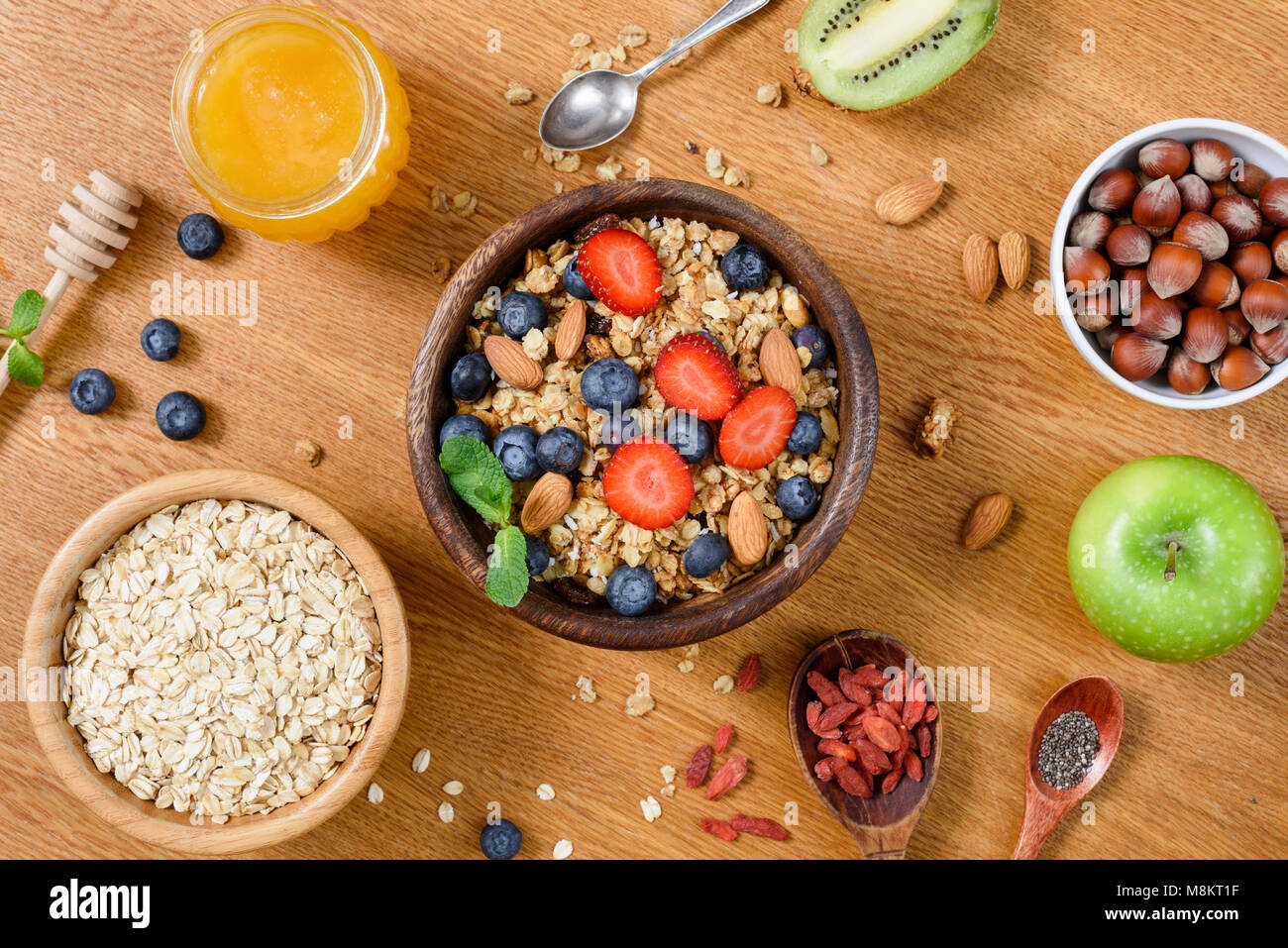 Una Sana Colazione Nutriente Cibi Sulla Tavola Di Legno Avena Muesli Frutta Miele E Super Foods Tabella Vista Superiore Foto Stock Alamy