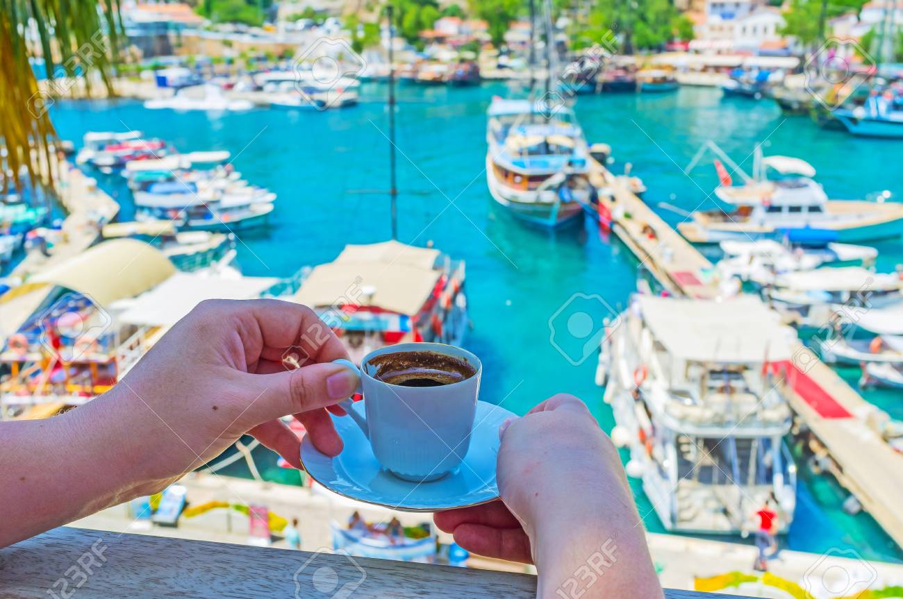 Immagini Stock Guarda Il Vecchio Porto Di Kaleici Dal Ristorante Panoramico Con Una Tazza Di Caffe Turco Forte E Caldo Antalya In Turchia Image