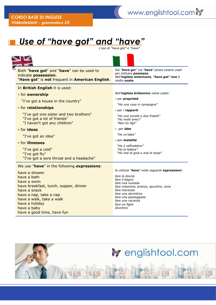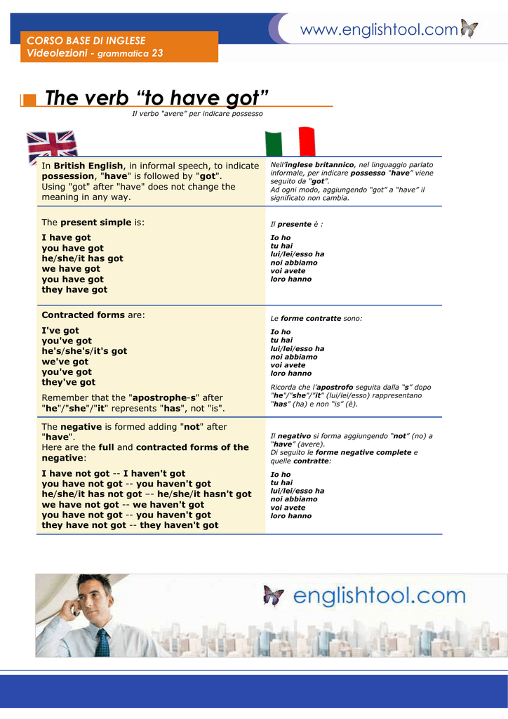 Uno degli esercizi di inglese che non può mancare dopo aver studiato il verbo avere in inglese è quello di scrivere frasi a piacere che contengano il suddetto verbo in tutte le forme possibili (affermativa, negativa, contratta, interrogativa) Nel caso in questione il verbo have verrà usato nelle frasi sottostanti solo al Present Simple solitamente impiegato per indicare qualcosa che si. Have got and have English Grammar Today una guida di riferimento alla grammatica e all'uso dell'inglese parlato e scritto Cambridge Dictionary. Got WordReference English dictionary, questions, discussion and forums All Free.