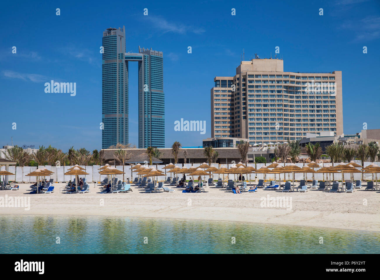 Emirati Arabi Uniti Abu Dhabi Spiaggia Presso Gli Alberghi Intercontinental Hotels Con St Regis Hotel A Sinistra Foto Stock Alamy