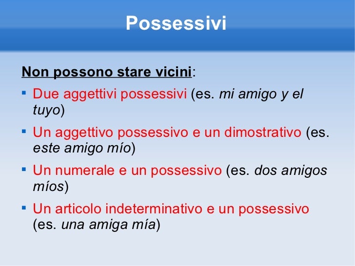 Esercitazione interattiva in spagnolo Esercizio sui possessi, a scelta multipla e con soluzioni Livello base ( A1, ). Gli aggettivi posposti si usano in uno dei casi seguenti C'è un dimostrativo Este amigo mío C'è un pronome, tranne todo Ningún amigo mío (ma Todos mis amigos !) C'è un articolo indeterminativo, o determinativo (in quest'ultimo caso assume valore rafforzativo). In spagnolo abbiamo sei diversi tipi di aggettivi possessivi mi (s) – mio / mia (miei / mie) mi ventana – la mia finestra, mis ventanas – le mie finestre tu (s) – tuo / tua (tuoi / tue) tu mano – la tua mano, tus manos – le tu mani su (s) – suo / sua (suoi / sue), (formale).