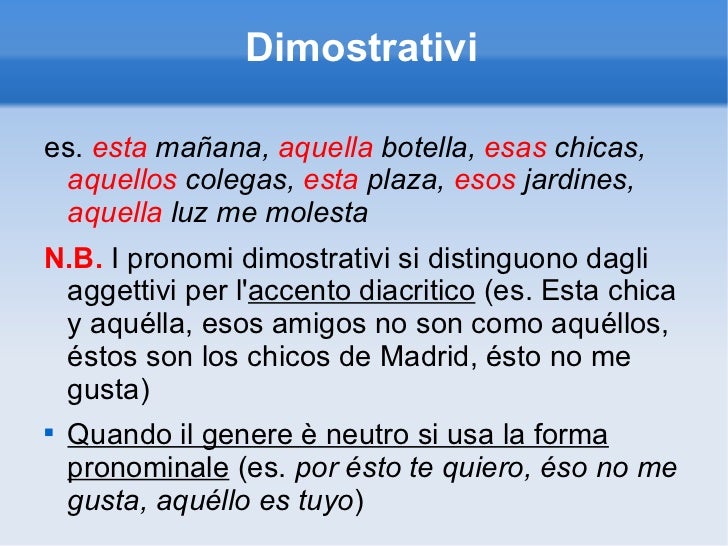 Aggettivi in spagnolo. Formazione dei diminutivi e degli accrescitivi in spagnoloForma il diminutivo o l'accrescitivo adeguato (Punteggio /) Formazione dei diminutivi e degli accrescitivi in spagnolo Scegli la soluzione corretta (Punteggio /) 5 (Qualificativi) aggettivi in spagnolo 0/32 Genere e numero degli aggettivi in spagnolo. Pronomi e aggettivi dimostrativi Pronombres y adjetivos demostrativos questo questa codesto codesta quello quella questi queste codesti codeste quelli quelle éste ésta ése ésa aquél aquélla éstos éstas ésos ésas aquéllos aquellas In spagnolo esistono anche i pronomi neutri esto, che traduce l'italiano "questo" nel senso di. Aggettivi dimostrativi in spagnolo (Los Adjetivos Demostrativos en español) SINGOLARE PLURALE Maschile Femminile Maschile Femminile Este (questo) Esta (questa) Estos (questi) Estas (queste) Ese (questo) Esa (questa) Esos (questi) Esas (queste) Aquel (quello) Aquella (quella) Aquellos (quelli) Aquellas (quelle) Concordano in genere e numero con il sostantivo e generalmente lo precedono Non lo.