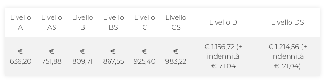 Livello A € 636, Livello AS € 751, Livello B € 809,71 Livello BS € 867,55 Livello C € 925,40 Livello CS € 9,22 Livello D € 1156,72 Livello DS € 1214,56 ( indennità.