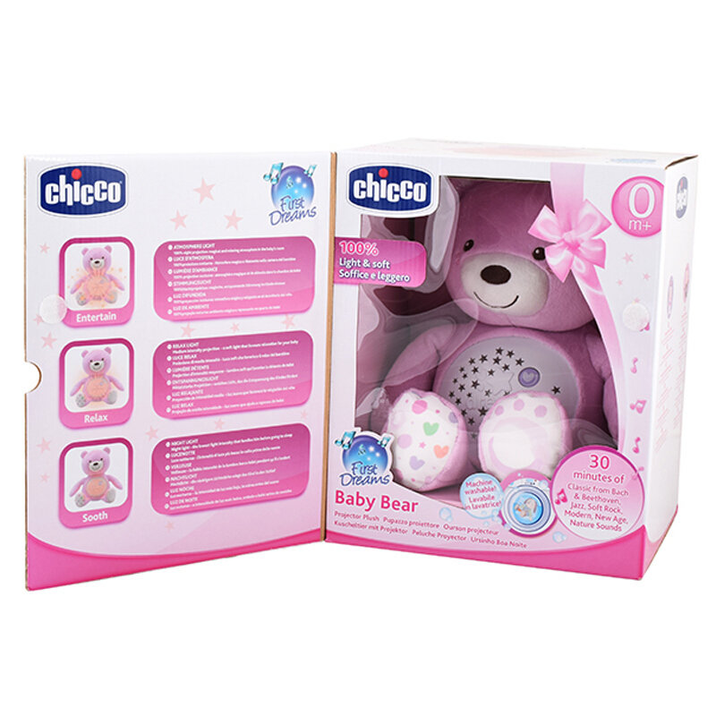 Chicco Baby Bear Pink ,Soft plush night projector & music,0 Months Happy Dreams 5 out of 5 stars (3) 3 product ratings Chicco Baby Bear Pink ,Soft plush night projector & music,0 Months Happy Dreams £1999 Click & Collect Free postage Chicco BABY BEAR Projector Musical Night Light Plush Teddy Neutral NEW Box Poor. 100% fluffy and perfect for cuddling, with soft plastic inserts and machine washable;. Then the Chicco "Baby Bear" is the right product for you The stars that are projected on the ceiling, and the soft music will make your little one feel safe and calm and thus provide the best conditions for falling asleep quickly The light effects can be set in 3 different levels star projection at maximum brightness, relaxation light with.