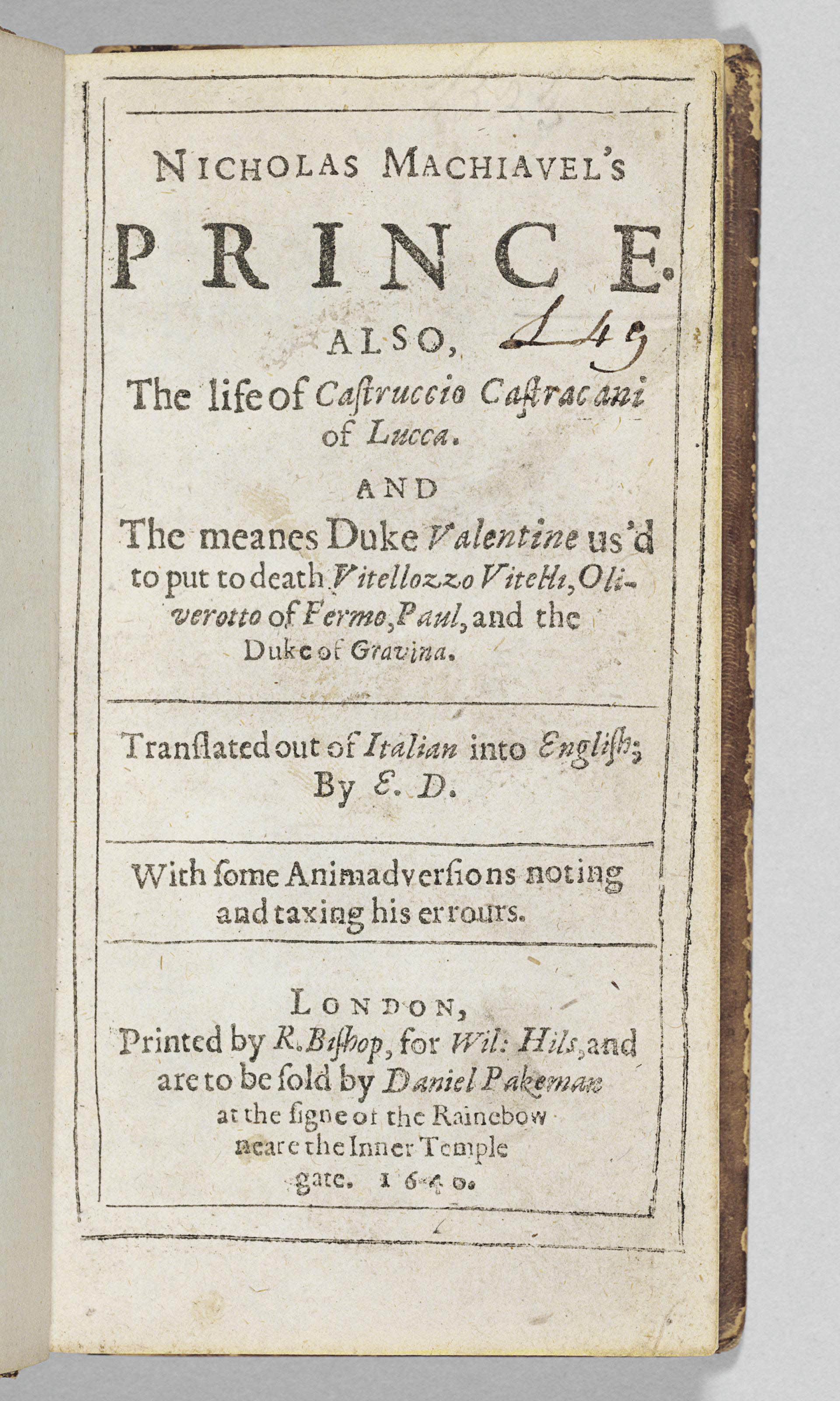 Machiavelli Niccoloi 1469 1527 Nicholas Machiavel S Prince Also The Life Of Castruccio Castracani Of Lucca And The Meanes Duke Valentine Us D Sold At Auction On 12th November Bidsquare