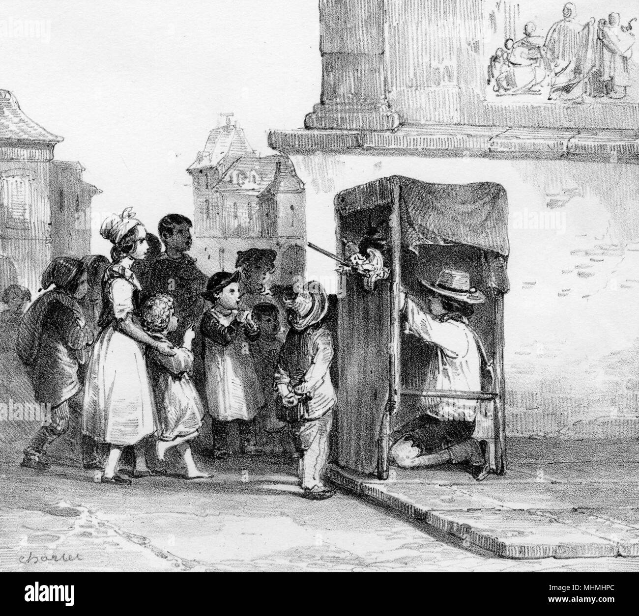 Un Ragazzo Francese Mette Su Uno Spettacolo Di Marionette Per Divertire I Bambini Della Strada Data Circa 1840 Foto Stock Alamy
