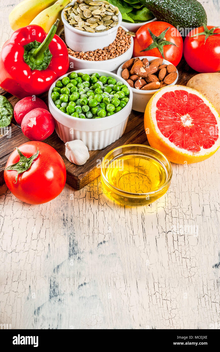 Cibo Sano Sfondo Trendy Dieta Alcalina Prodotti Frutta Verdura Cereali Noci Oli Calcestruzzo Leggero Sfondo Soprastante Chiudi Vista Foto Stock Alamy
