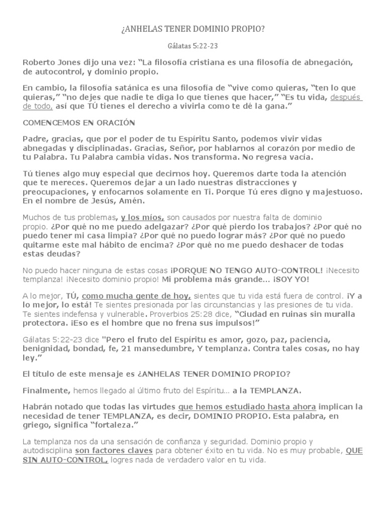 Disciplina, ie control de uno mismo—dominio propio Dominio Propio Capacidad que tiene un individuo de controlarse o de equilibrar sus acciones y emociones Se puede. Necesitas tener dominio propio para no gritarle a una persona que es hostil contigo A veces necesitas tener dominio propio para no faltarle el respeto a tus padres A veces necesitas tener dominio propio para dejar de jugar y tener tiempo para leer la Biblia Cuando. Andando en el Espíritu Dominio Propio (La templanza) Hermanas al estar en Cristo somos llamadas a vivir una vida en libertad del pecado, una vida agradable a Dios y de bendición a los demás Esta vida nueva debe ser andando en el espíritu y no cediendo a los deseos de nuestra carne (Gal 516).