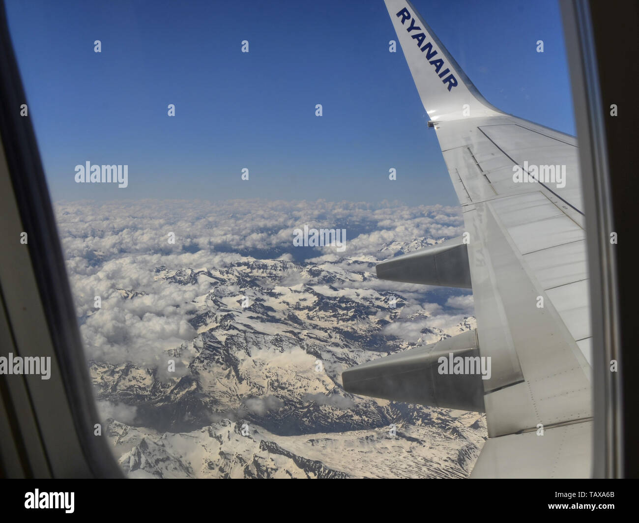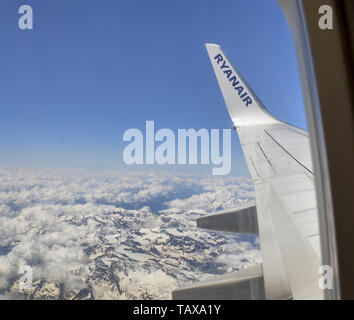 Caselle Airport Italy June 14 18 Ryanair Flight To London Stansted Airport View Of The Wing With The Ryanair Logo With The Background Of The Mo Stock Photo Alamy