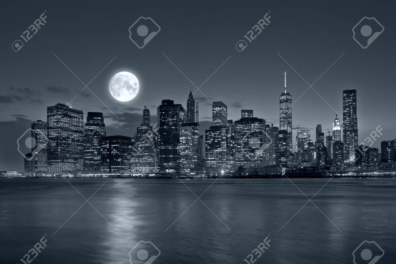 Immagini Stock Vista Panoramica Skyline Di New York City Manhattan Di Notte Con La Tonalita Blu Di Grattacieli E Luminosa Luna Piena Image