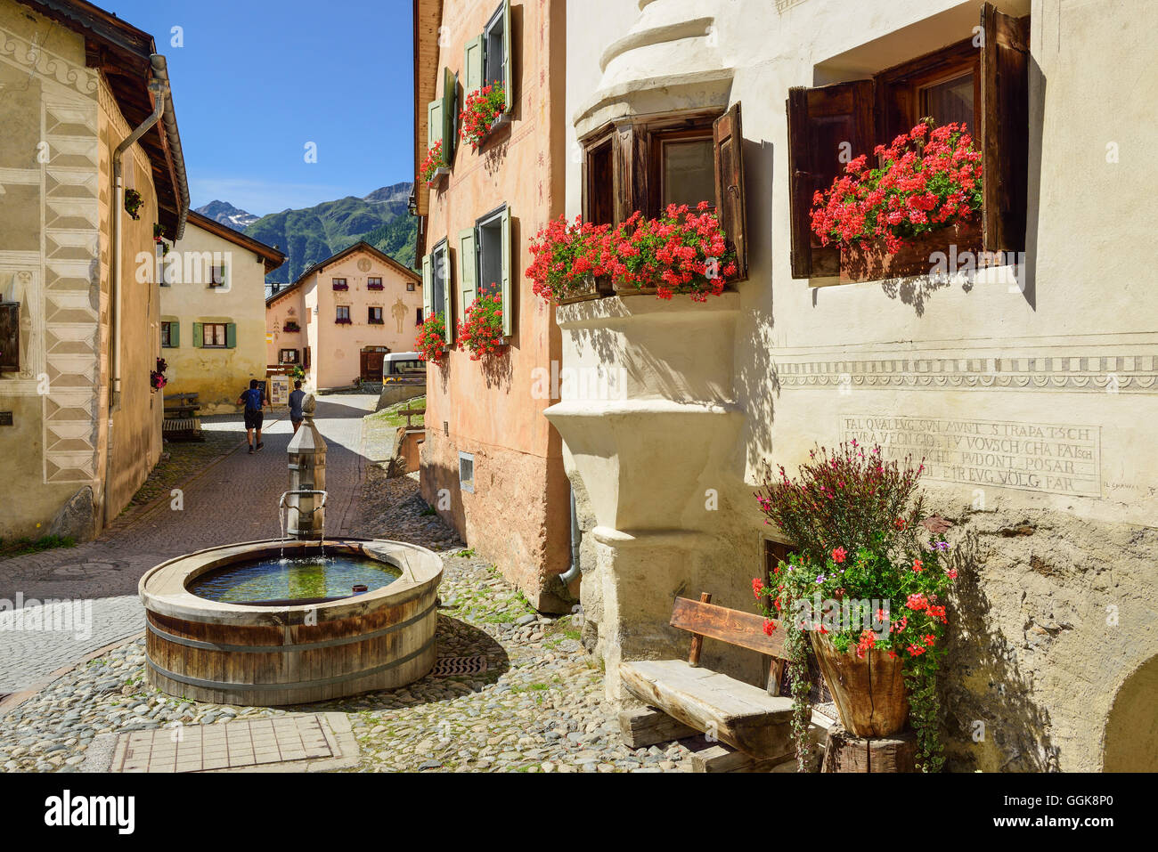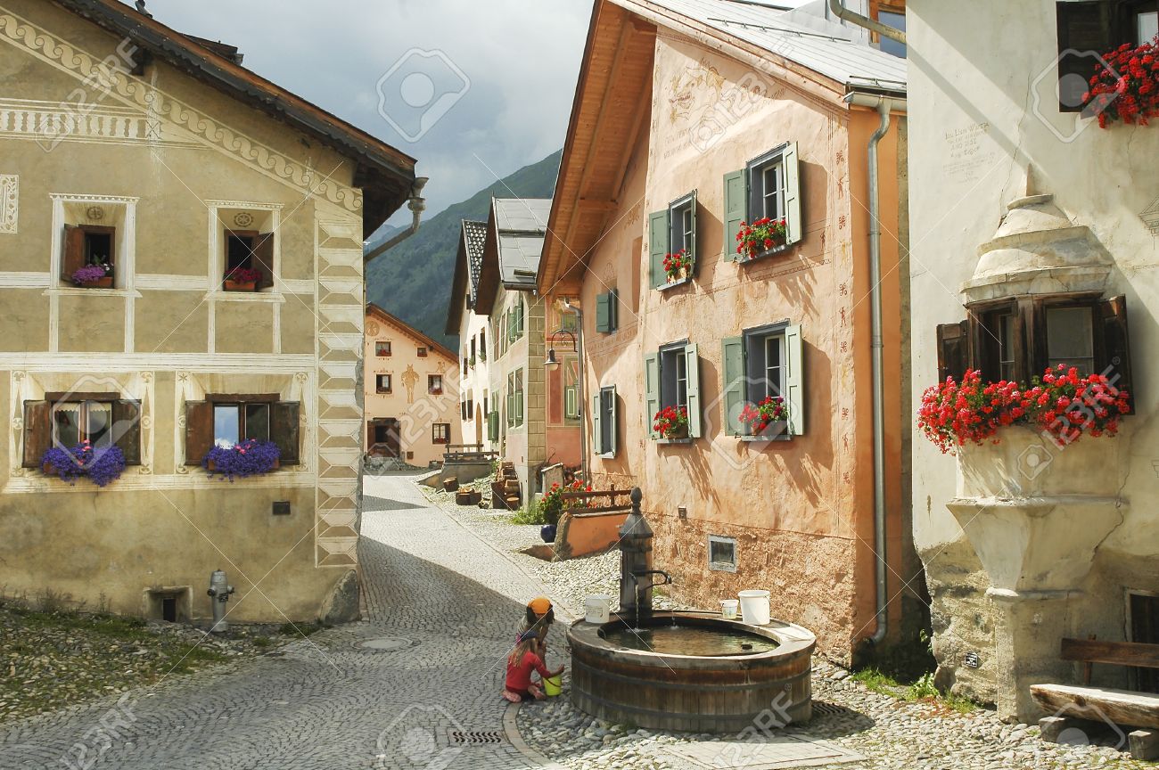 Guarda Pueblo Tipico De Engadina Grisones Suiza Casas Antiguas Con Flores Dos Ninas Que Juegan En La Fuente Fotos Retratos Imagenes Y Fotografia De Archivo Libres De Derecho Image