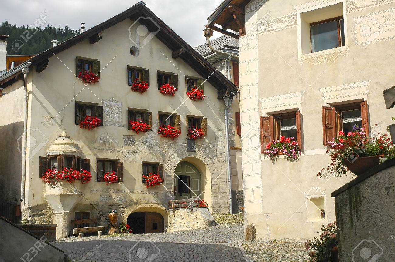Guarda Pueblo Tipico De Engadina Grisones Suiza Viejas Casas Con Flores Fotos Retratos Imagenes Y Fotografia De Archivo Libres De Derecho Image