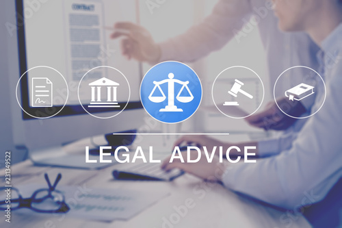 Legal Advice And Lawyer Consulting Service Concept With Icons Of Justice Court Law Contract And In Background Two Consultant Working On Document On Computer Screen Business Legislation Notary Buy This Stock