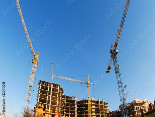 Construction Site Background Three Industrial Cranes Near Concrete Building Building Site Buy This Stock Photo And Explore Similar Images At Adobe Stock Adobe Stock