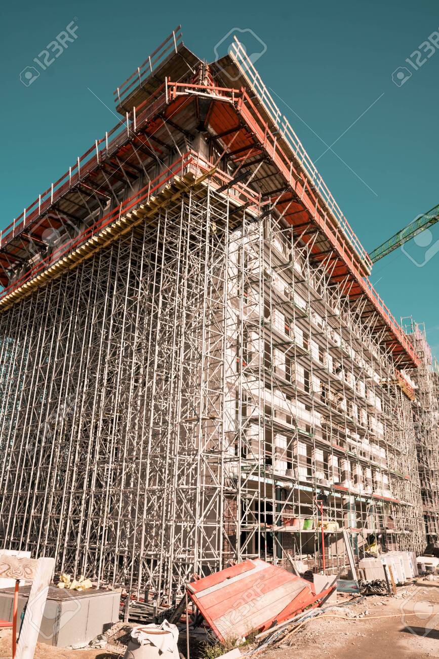 Construction Site Background And Working Tower Crane Over A Concrete Building With Scaffolding Elements And Details In The Evening Light Stock Photo Alamy