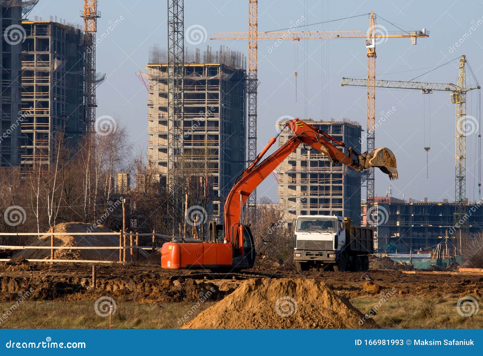 Excavator At A Construction Site On A Background Of A Construction Cranes And Building Backhoe Dig The Ground For The Foundation Stock Image Image Of High Machinery