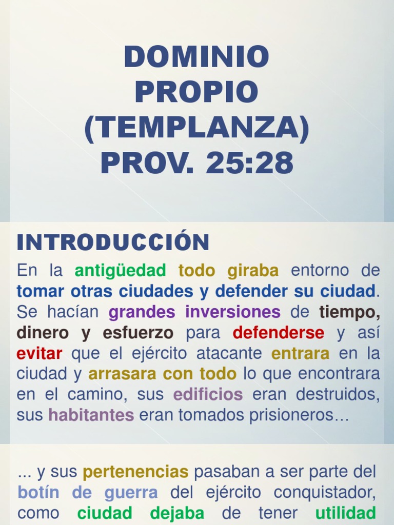 Dominio propio es un valor personal que debería formar parte del carácter de un ser humano;. El autodominio o dominio propio, es la capacidad propia de controlarse, de saber administrarse emocional, mental, física y espiritualmente En las Escrituras se menciona poco sobre el dominio propio, pero las veces en las que se habla de esta virtud, nos deja claro que es importante el poseerlo, y aún más en estos tiempos. Todas las cosas me son licitas, mas yo no me dejaré dominar por ninguna” 1 Corintios 612 (RVR) Desde los origines de la humanidad, el ser humano deseo tener dominio La historia muestra como los poderosos quisieron siempre ampliar sus dominios.
