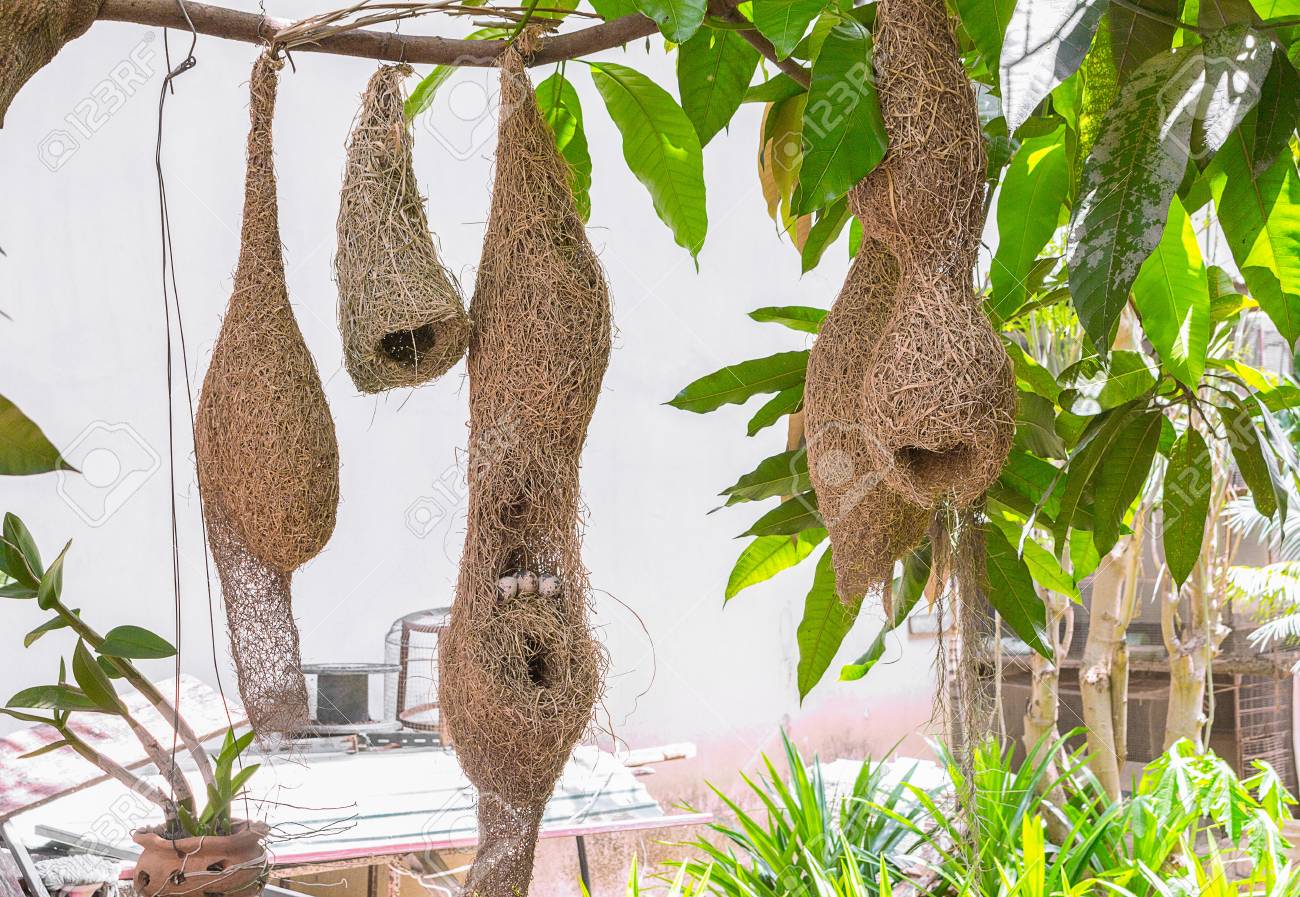 Los Nidos De Alondra Y Los Huevos De Las Aves El Nido Del Pajaro Tejedor Hecho De Heno Los Nidos De Alondra En Las Ramas De La Zona De Forma Natural Y