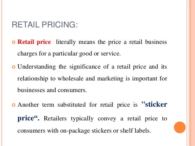 Define Net retail price means the price at which the distilled spirits is sold on retail in at least five (5) major supermarkets in Metro Manila, excluding the amount intended to cover the applicable excise tax and the valueadded tax For distilled spirits which are marketed outside Metro Manila, the ‘net retail price’ shall mean the price at which the distilled spirits is sold in at. ‘Various laws, often imposed by the states, restrained price competition in retail trade’ ‘The retail price is just under $100, which is rather inexpensive for its deluxe features’ ‘So our peak performance has nothing to do with expanded retail trade, although retail trade productivity has grown a lot’. Amongst the most daunting tasks required to survive the retail market is the knowhow involved in setting good, competitive, attractive prices Without a smart strategy, retailers often find themselves in two broad categories of bad pricing low, cheap, attractive prices that grab attention but sacrifice a good margin;.