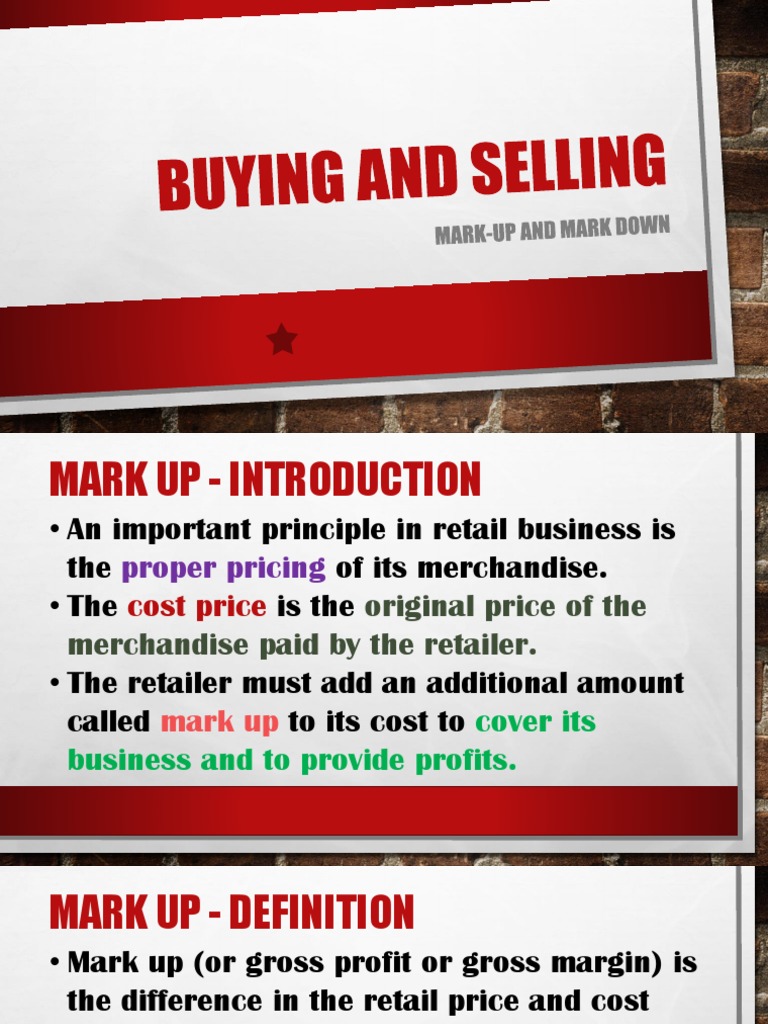 Retail price definition of retail price ADVFN's comprehensive investing glossary Money word definitions on nearly any aspect of the market Stock market dictionary. The lowest price may not necessarily mean the best price Profit is the difference between cost and price This can be very high when an urgent situation is exploited by the salesman Cash flow, overall growth, and profitability are sort out by the retailers in order to survive the retail business. Retail Markups are based on Selling price, not cost The example shown is a MarkOn The markup in the example is a 50% markup, meaning that of the retail price 50% is markup and 50% is cost The correct forumula to computer Retail selling price is Cost / (1 – Markup) where markup is expressed as a decimal value A 50 percent markup would.