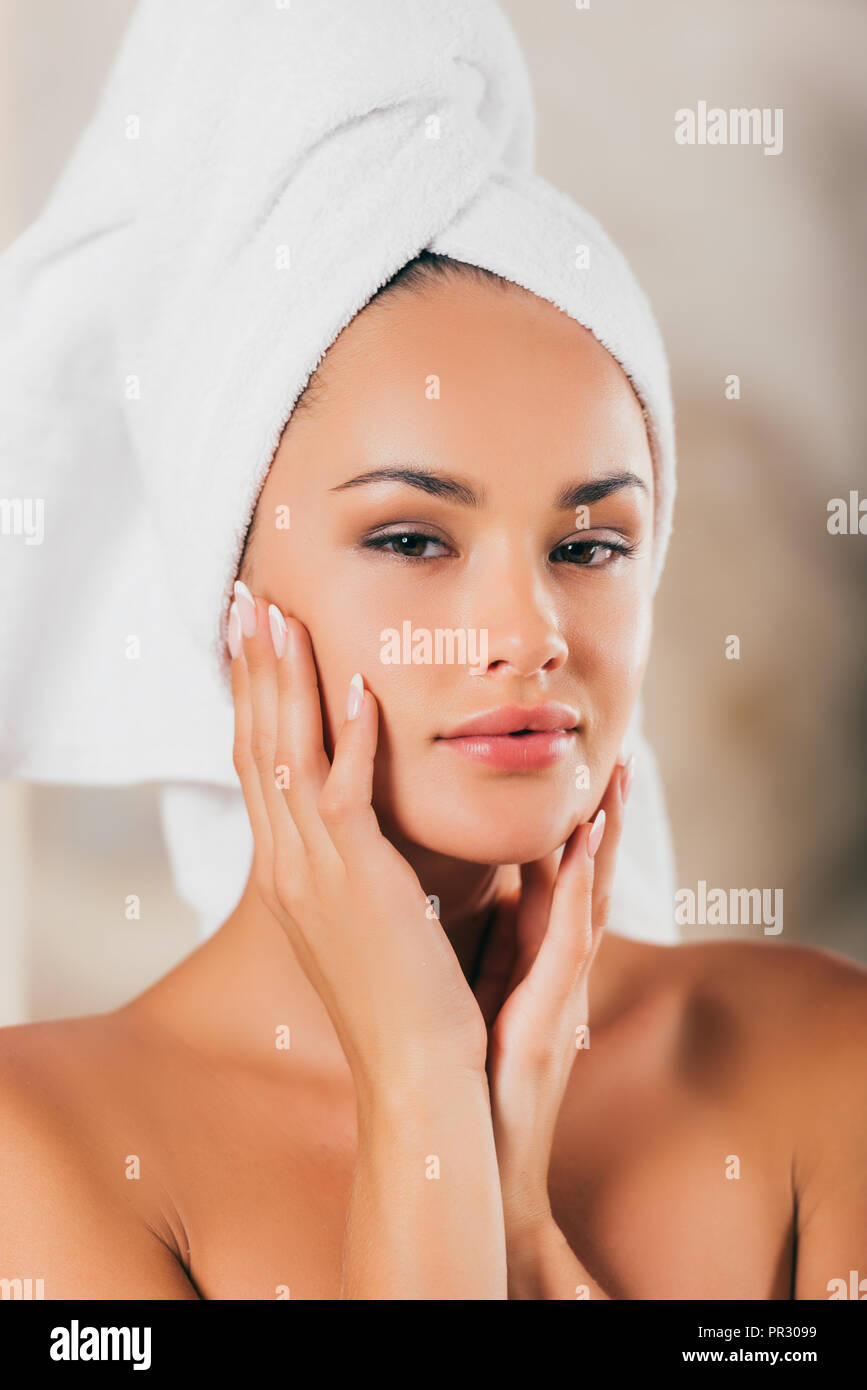 Giovane E Bella Bruna Donna Con Viso Pulito E Asciugamano Sul Suo Capo Isolato Foto Stock Alamy