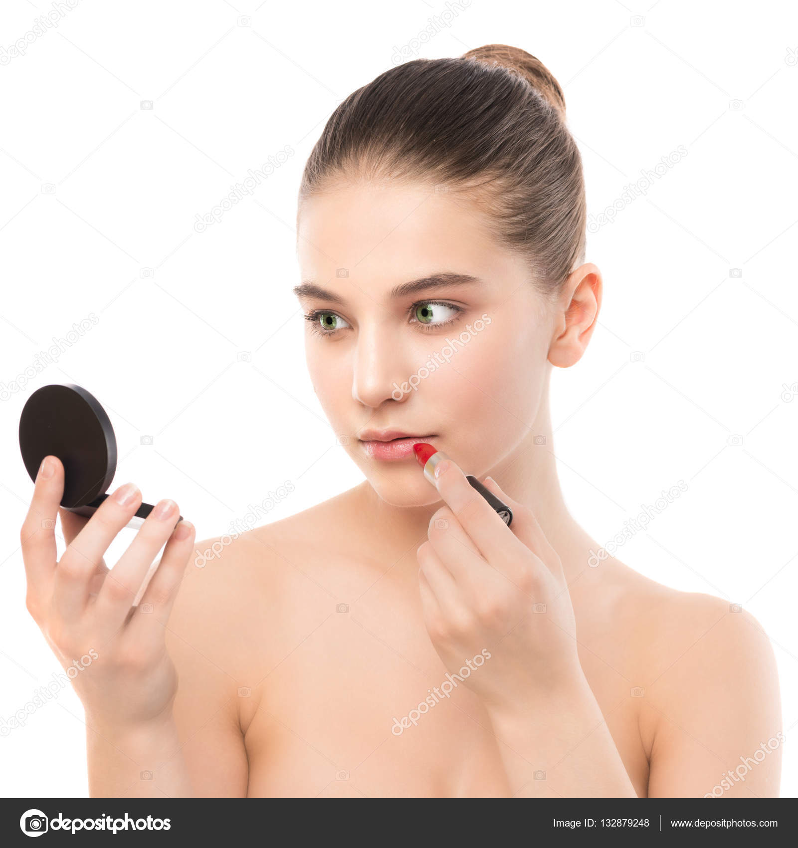 Giovane Donna Bruna Con Viso Pulito Perfetto Applicare Il Rossetto Usando Lo Specchio Isolato Su Un Bianco Foto Stock C Markin