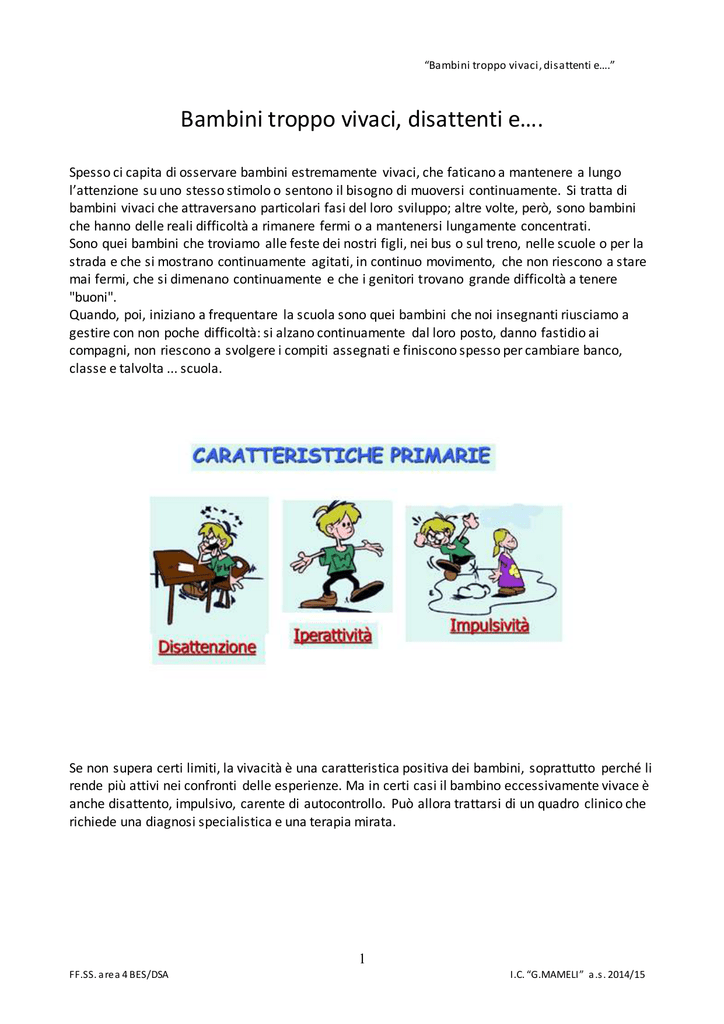 Beh, fino almeno ai 5 anni CRESCERE è una sfida e molti bambini diventano troppo vivaci o aggressivi proprio per soddisfare il loro bisogno di affermazione verso cose che non comprendono appieno Quindi un bambino che non si ribella MAI potrebbe essere più problematico di uno troppo vivace e aggressivo (con dei limiti, ovvio). Bambini troppo vivaci, disattenti e Spesso ci capita di osservare bambini estremamente vivaci, che faticano a mantenere a lungo l’attenzione su uno stesso stimolo o sentono il isogno di muoversi ontinuamente Si tratta di bambini vivaci che attraversano particolari fasi del loro sviluppo;. Di bambini vivaci, ora definiti “iperattivi”, nelle scuole italiane ce ne sono sempre stati I bambini che trent’anni fa gli psichiatri avrebbero etichettato come affetti da “deficit di attenzione e iperattività” oggi sono artisti, operai, politici, insegnanti, commercianti, giornalisti, gente che manda avanti la società.