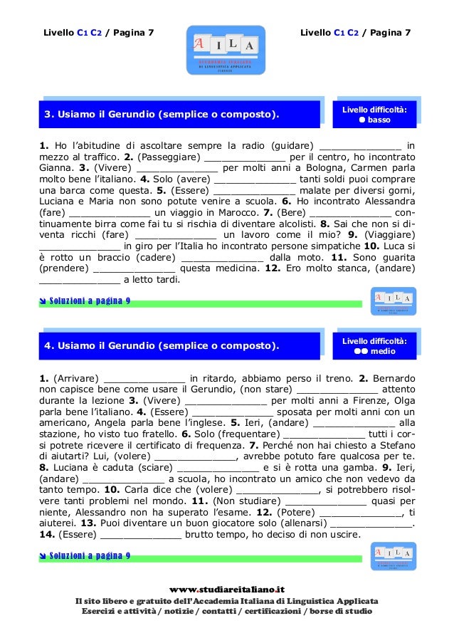 Si dice invece implicita se ha il verbo al gerundio, al participio o all’inifinito Vediamo insieme il gerundio come si forma e come si usa. Esercizi sul gerundio, ci sono tutti i principali irregolari che dovete sapere per il compito Gerundio irregolare – estargerundio. Esercizi di Italiano Metti alla prova la tua conoscenza della grammatica italiana Gerundio Presente.